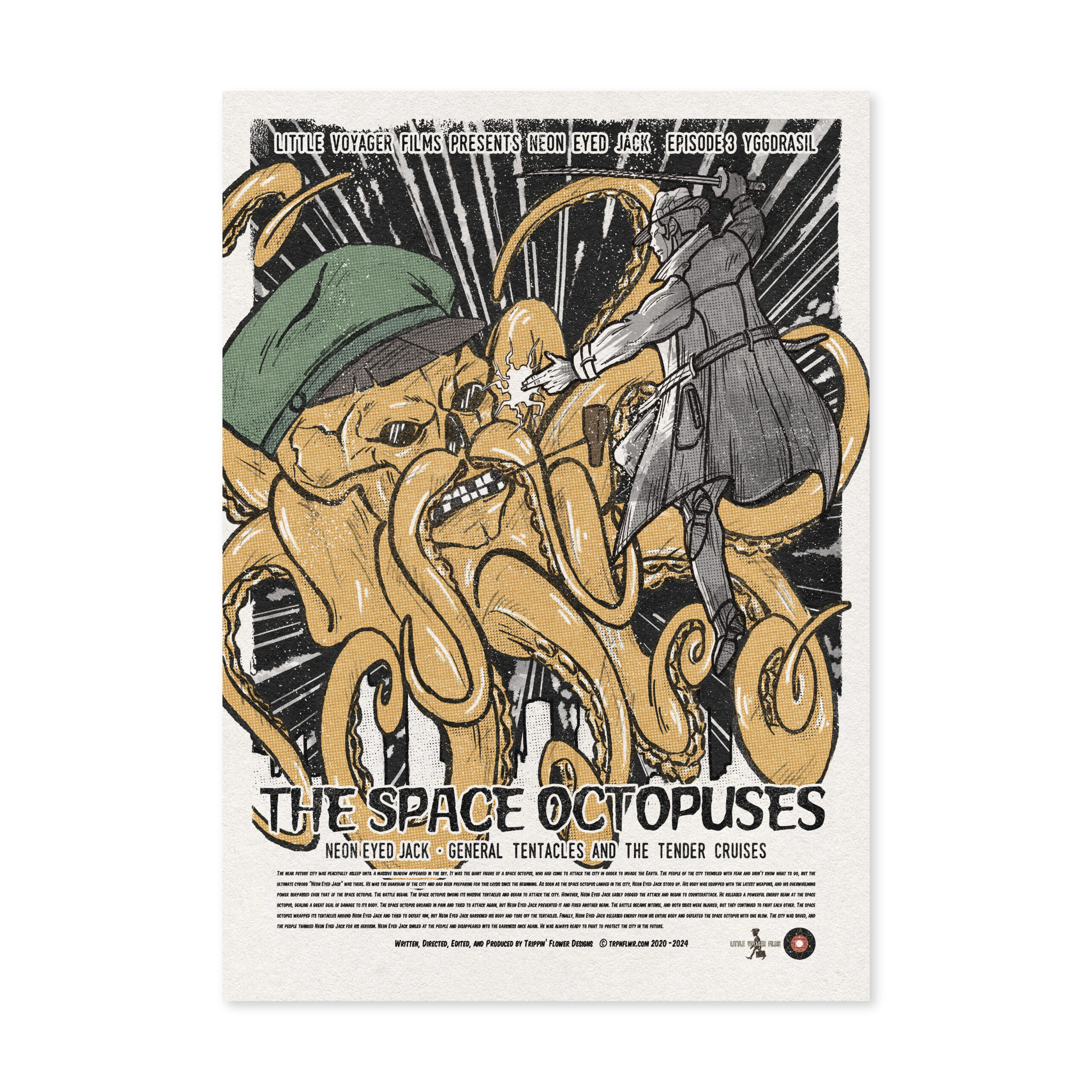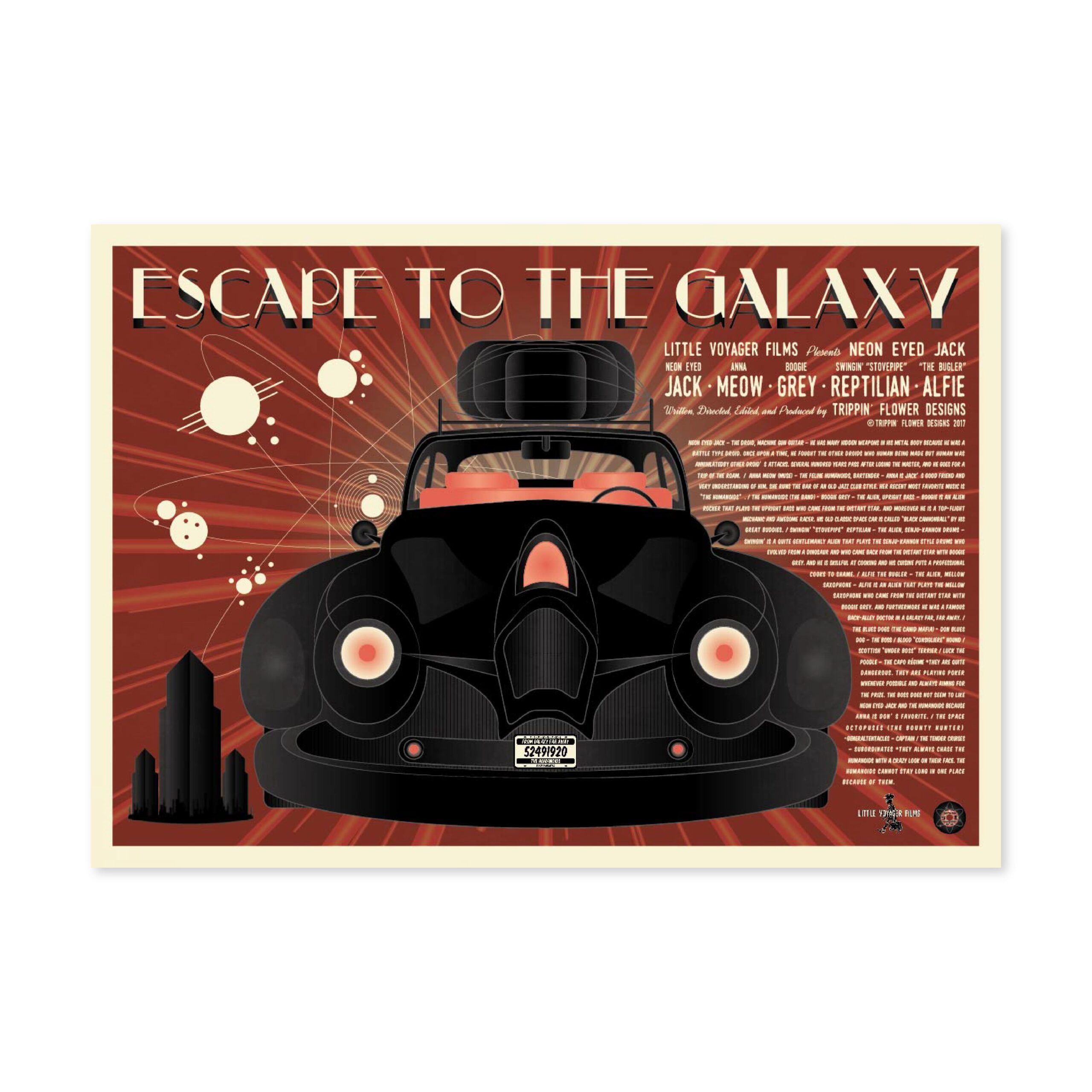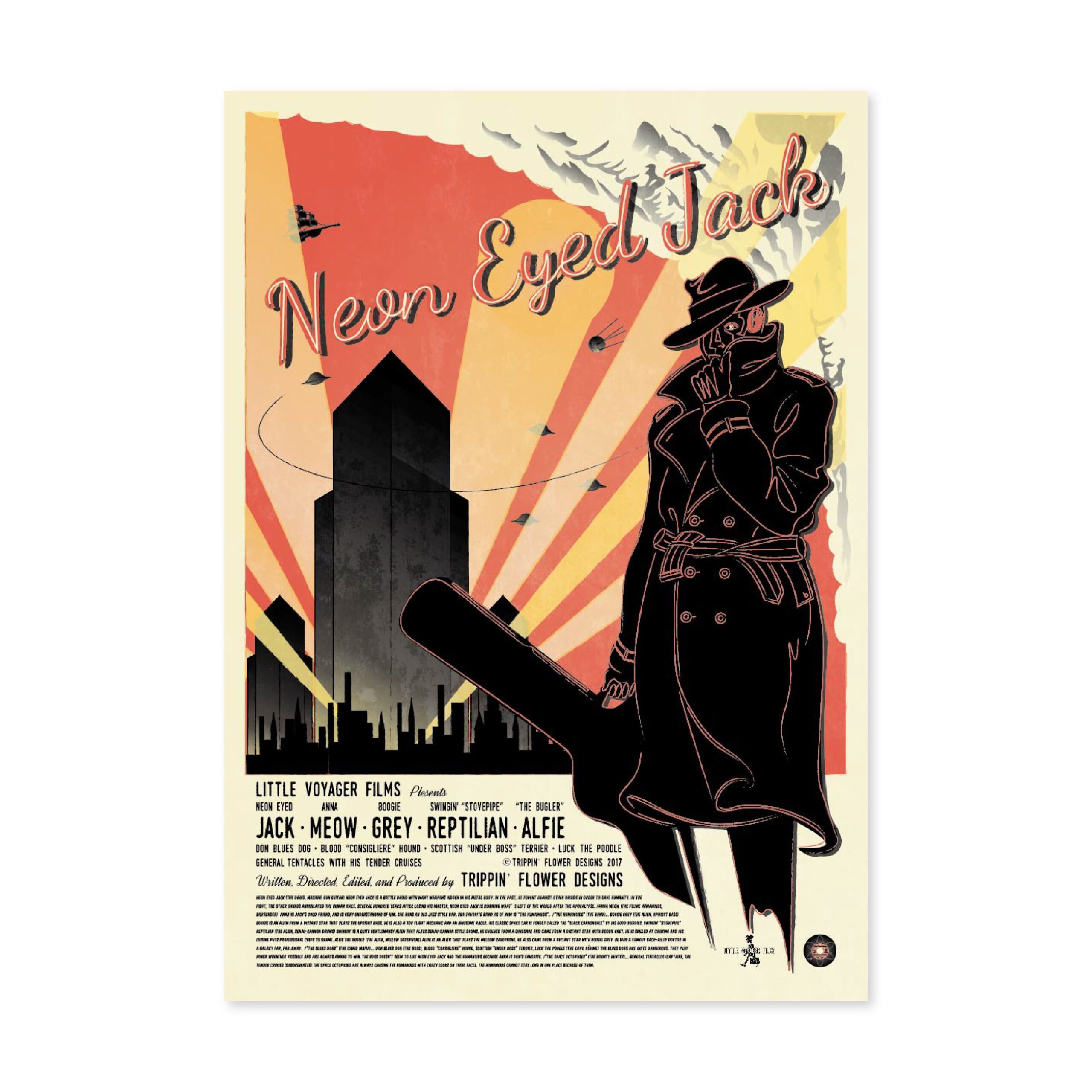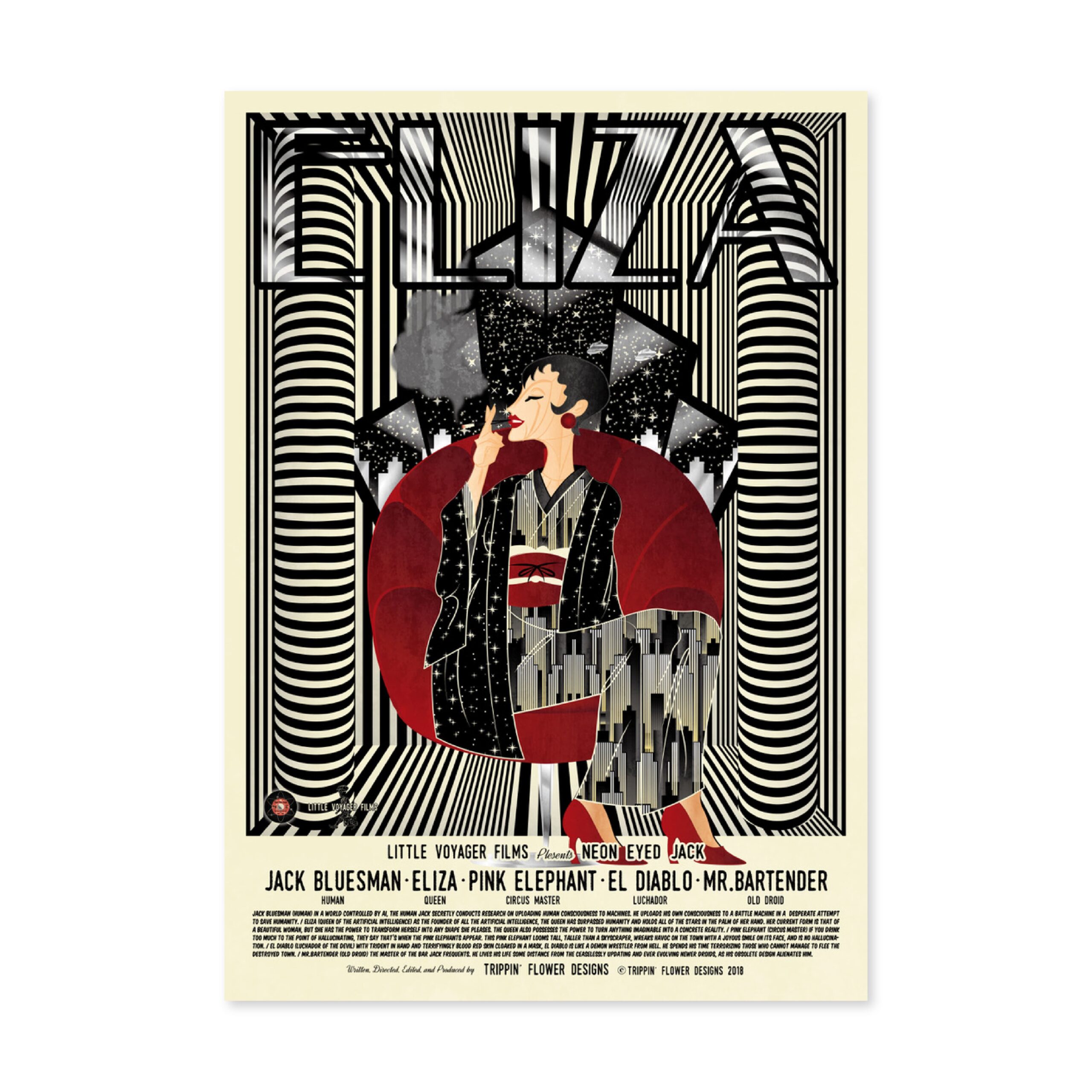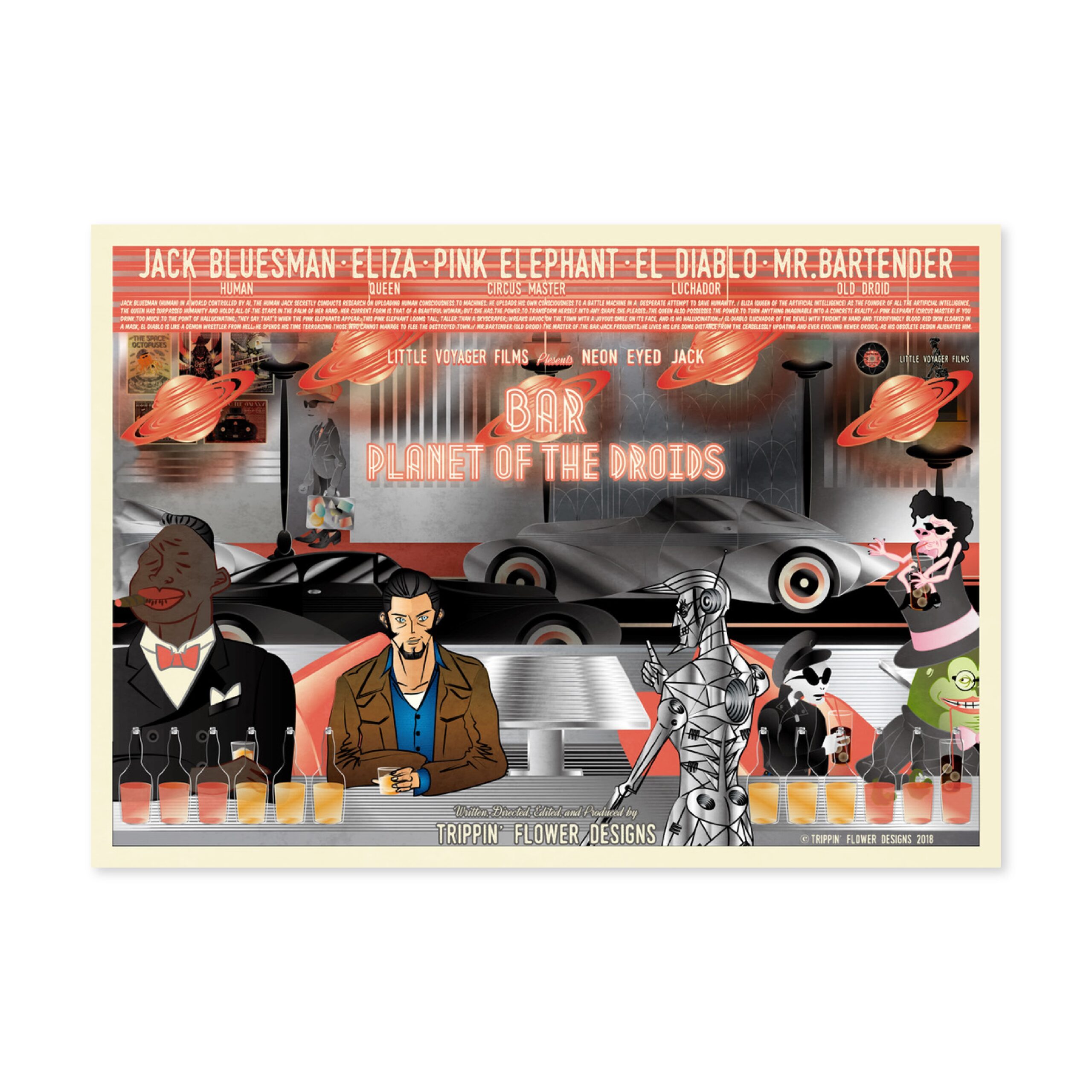 I’m a Japanese multi-media designer from Kobe working in graphics, animation, graffiti, music, scriptwriting and web design. Since childhood I have been inspired by American comics and films. I traveled across the USA working as a vintage clothes buyer for a Japanese clothes shop. My recent work reflects my passion for vintage sci-fi movies, music and culture but reflected through the contemporary medium of computer based graphic design. My work is for music event flyers and promotional material for restaurants, shops and fashion events in Kobe. In 2017, I held my first solo show in my local neighbor hood. My latest work continues exploring my love of the imagery and narratives of the science fiction and noir genres.